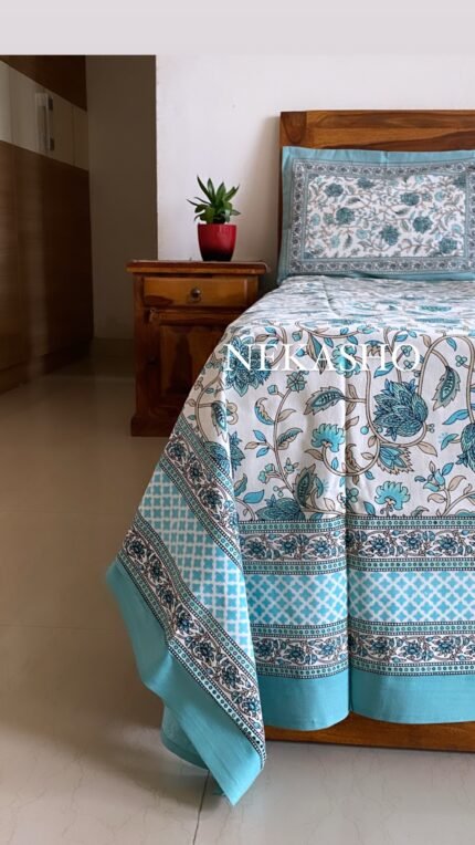 Neela Gul Handblocked Super King Size Cotton Bedsheet